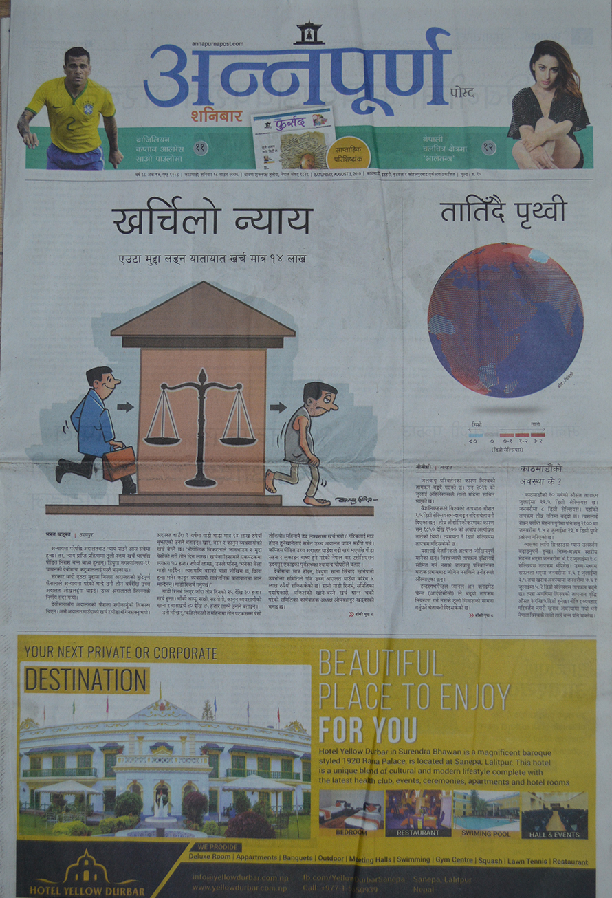 अन्नपूर्णले ‘खर्चिलो न्याय’ शीर्षक दिएर मुख्य समाचार बनाएको छ । खर्चिलो र झण्झटिलो न्याय सम्पादनका कारण मुद्दा लड्न असहज बन्दै गएको समाचारको सार छ ।
