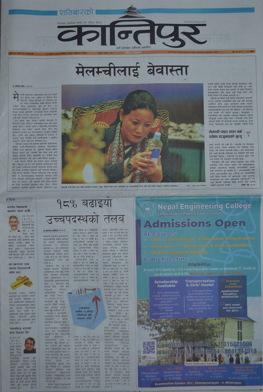 कान्तिपुरले ‘मेलम्चीलाई बेवास्ता’ शीर्षक दिएर आज मुख्य समाचार बनाएको छ । मेलम्ची खानेपानी आयोजनाको काम ठप्प भएको ८ महिना बिते पनि यसलाई सञ्चालनमा ल्याउनेबारे सरोकारवाला गम्भीर नदेखिएको समाचारको सार छ ।