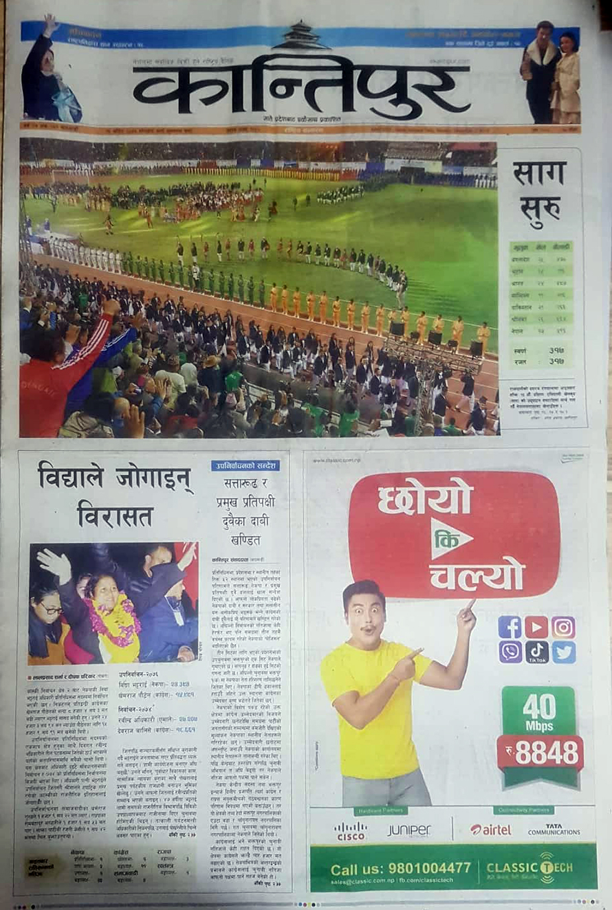 कान्तिपुरले ‘साग सुरु’ शीर्षक दिएर सागबारे मुख्य समाचार बनाएको छ । उपनिर्वाचनको समग्र मतपरिणामको समीक्षा र कास्की–२ को नतिजाबारे पनि कान्तिपुरले प्राथमिकतापूर्वक छापेको छ ।