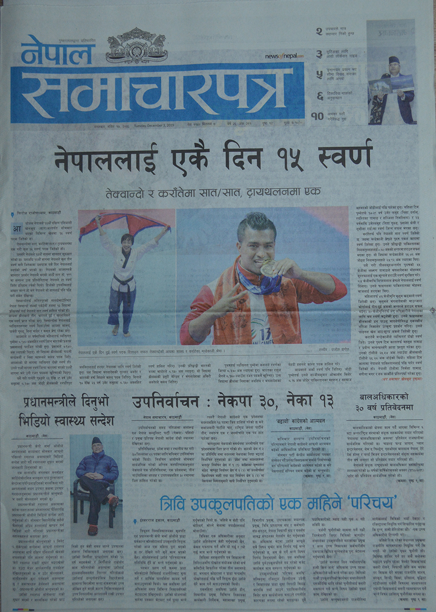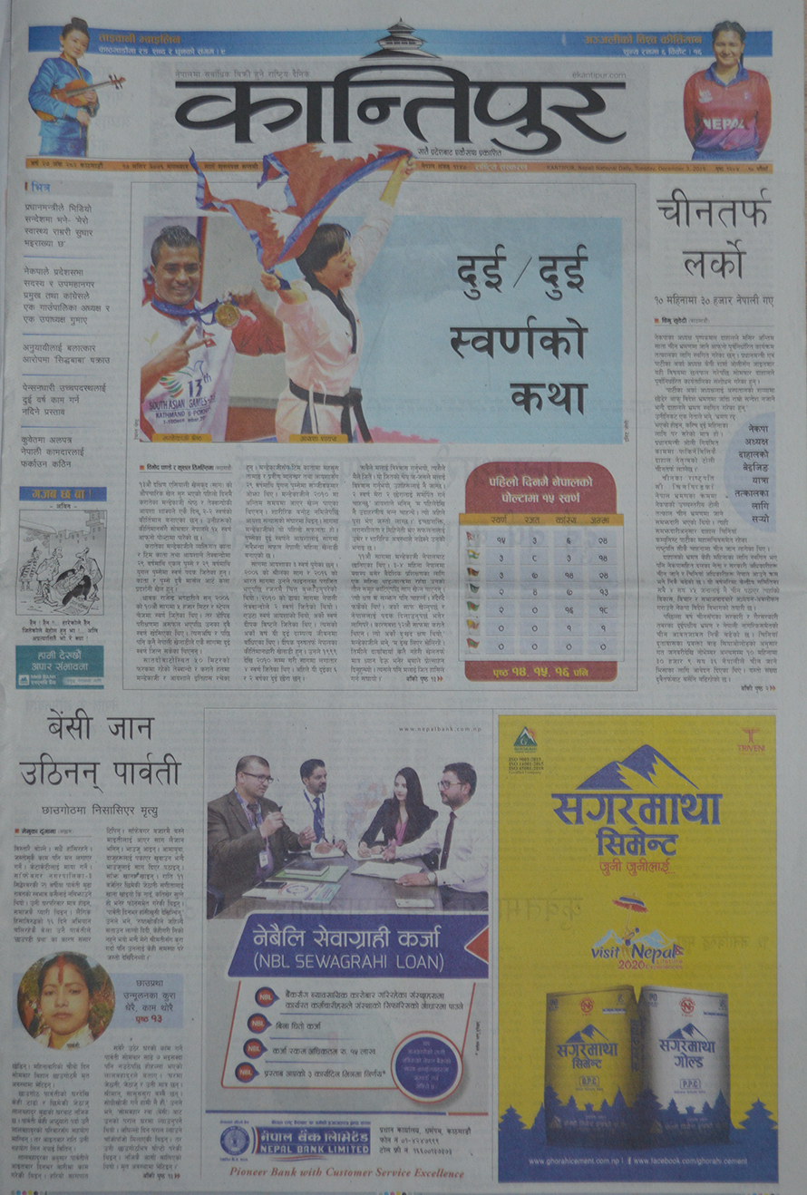 कान्तिपुरले अलि फरक कोणबाट सागमा २÷२ स्वर्ण हासिल गर्ने नेपाली खेलाडी मन्डेकाजी श्रेष्ठ र तेक्वान्दोकी आयशा शाक्यबारे मुख्य समाचार बनाएको छ ।