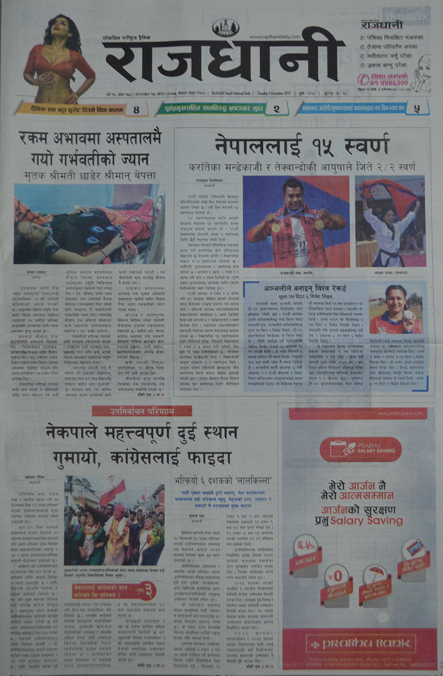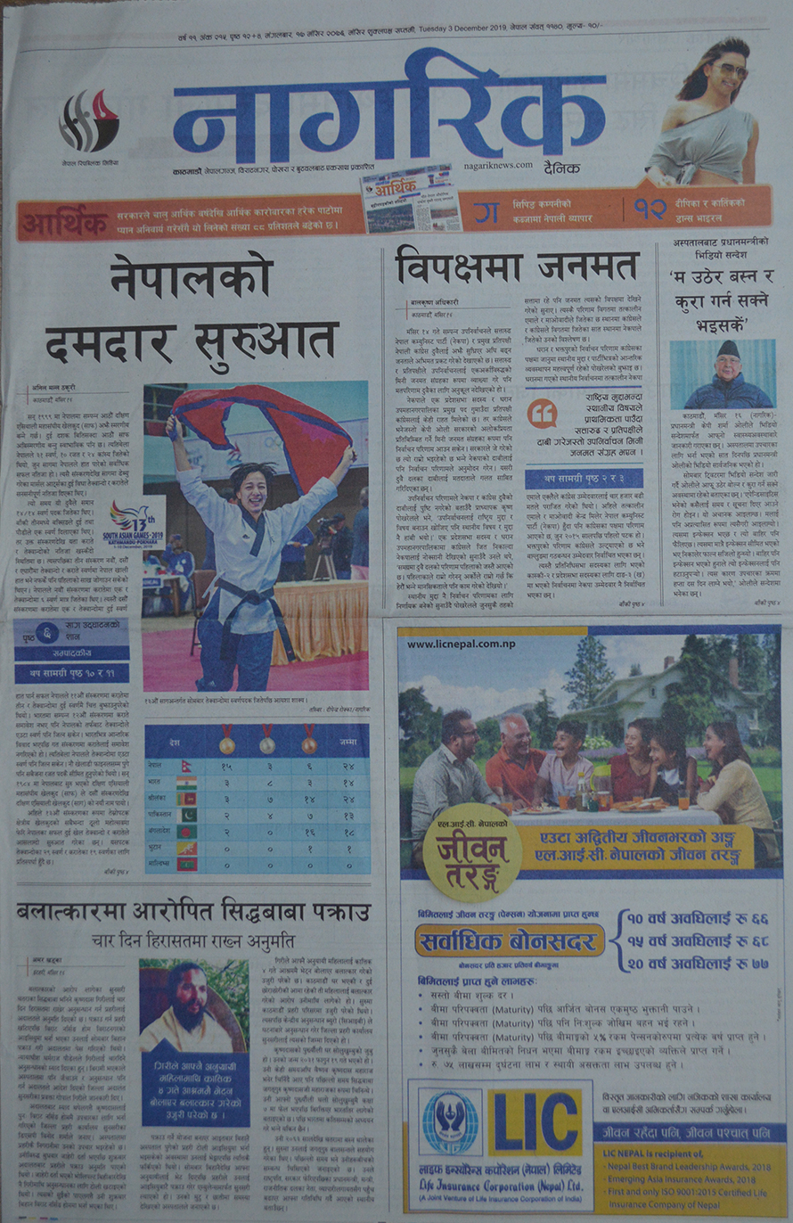 संघीय राजधानी काठमाडौंबाट आज प्रकाशित दैनिक पत्रिकाहरू दक्षिण एसियाली खेलकुद (साग) प्रतियोगितामय बनेका छन् । प्रतियोगिताको पहिलो दिनमै नेपालको पोल्टामा १५ स्वर्ण परेकोलाई पत्रपत्रिकाहरूले विविध शीर्षक दिएर छापेका छन् ।