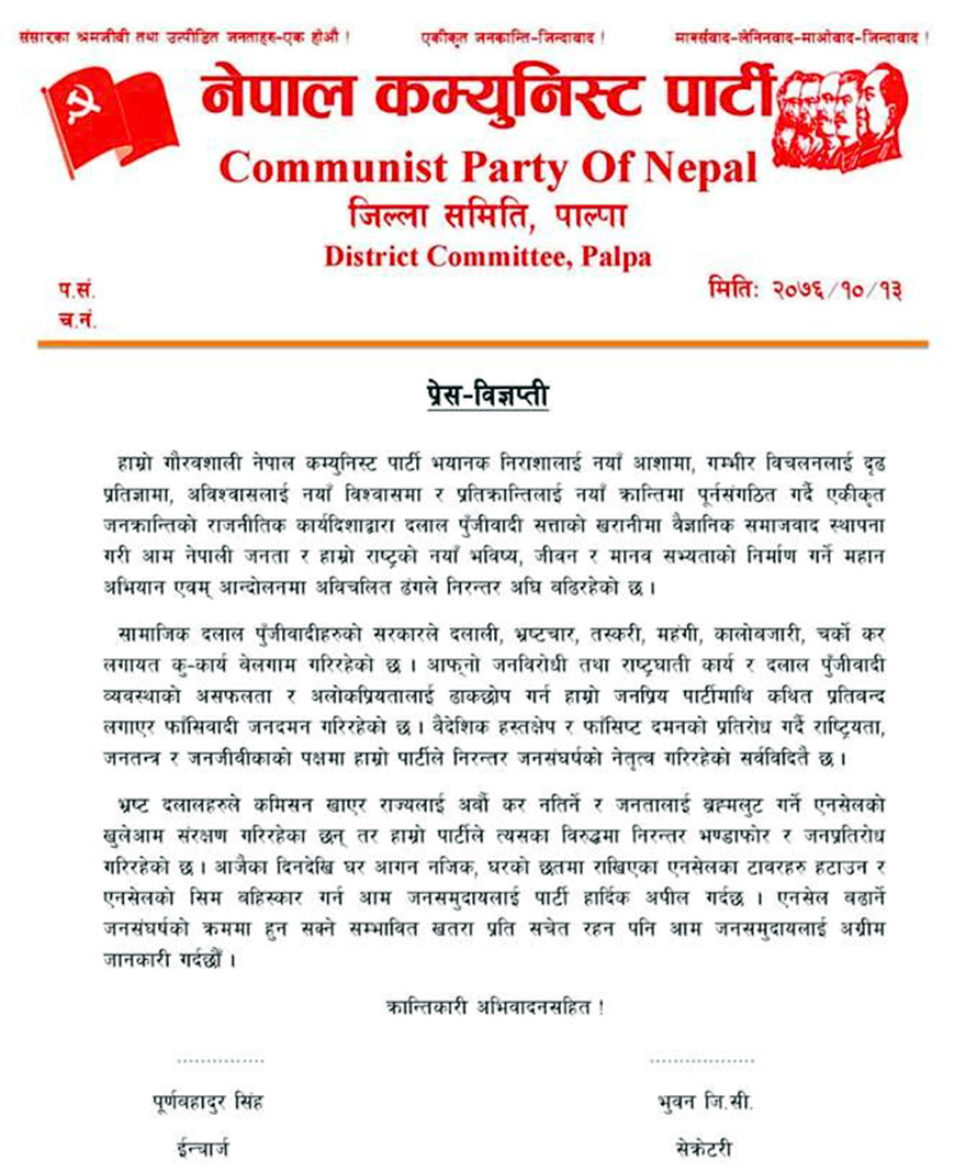 नेकपा पाल्पाले आइतबार एक प्रेस विज्ञप्ति जारी गर्दै एनसेल ‘बढार्ने जनसंघर्ष’ को क्रममा हुने सम्भावित क्षतिप्रति सचेत रहन सर्वसाधारणलाई अपिल गरेको छ ।