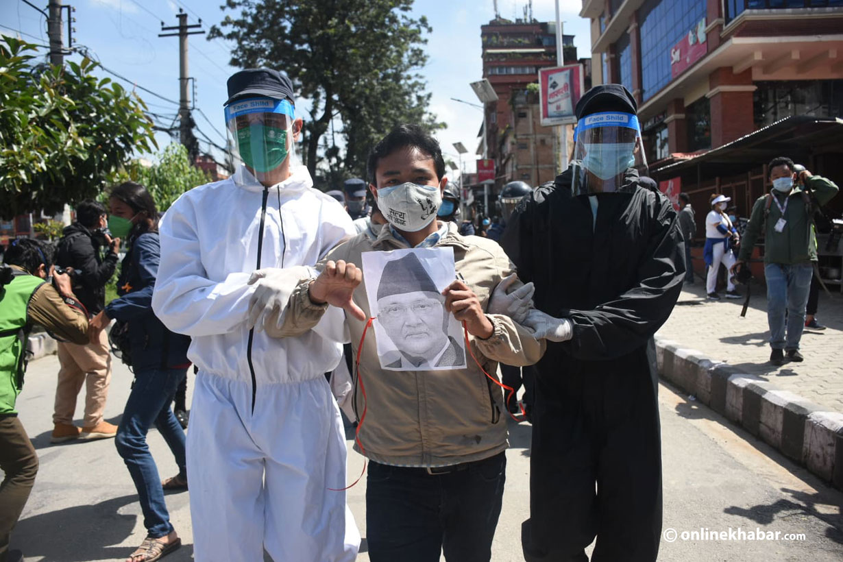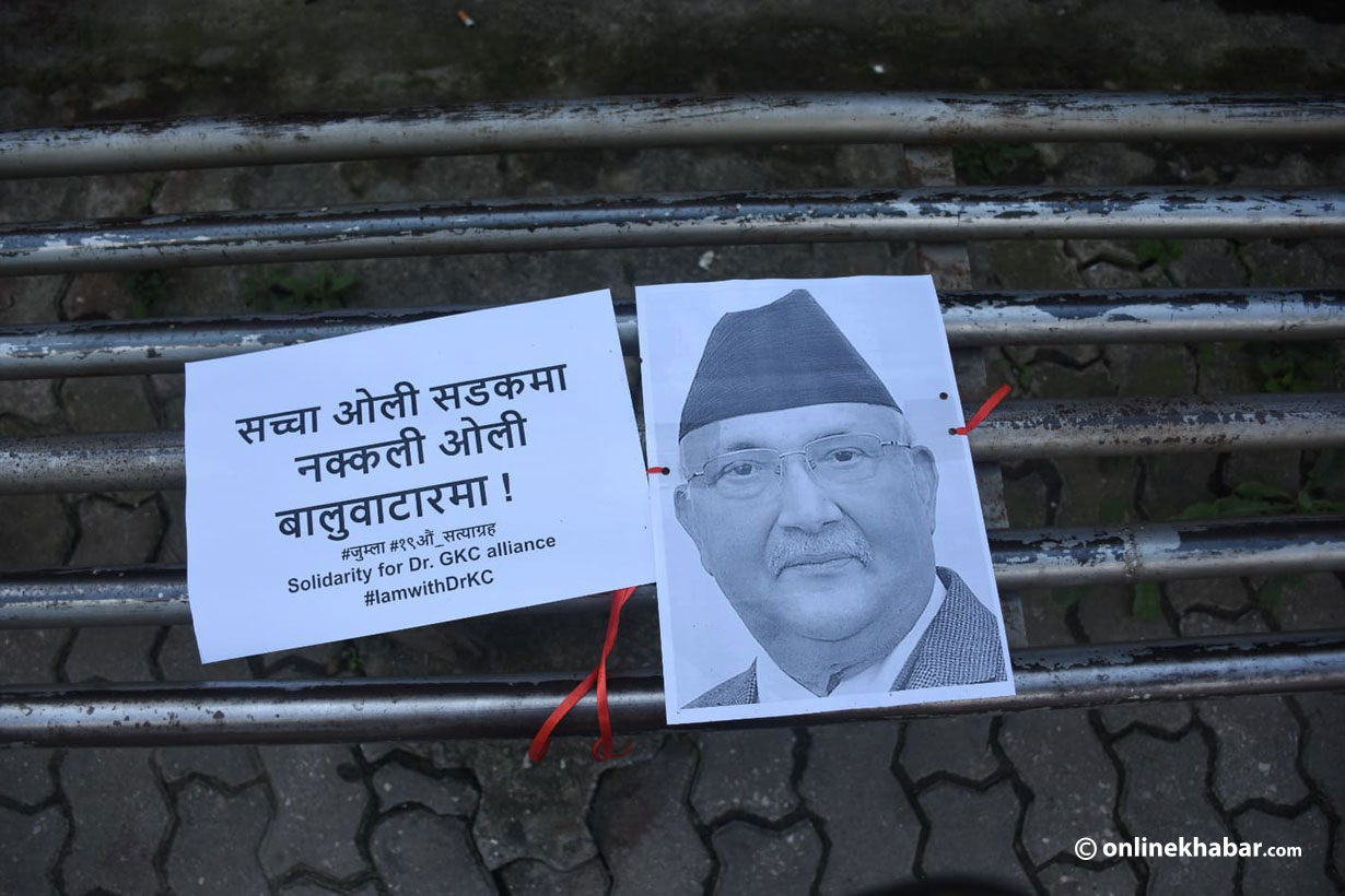 प्रदर्शनकारीले बोकेको प्रधानमन्त्री ओलीको तस्वीर अंकित पोस्टरमा ‘सच्चा ओली सडकमा, नक्कली ओली बालुवाटारमा’ लेखिएको थियो ।