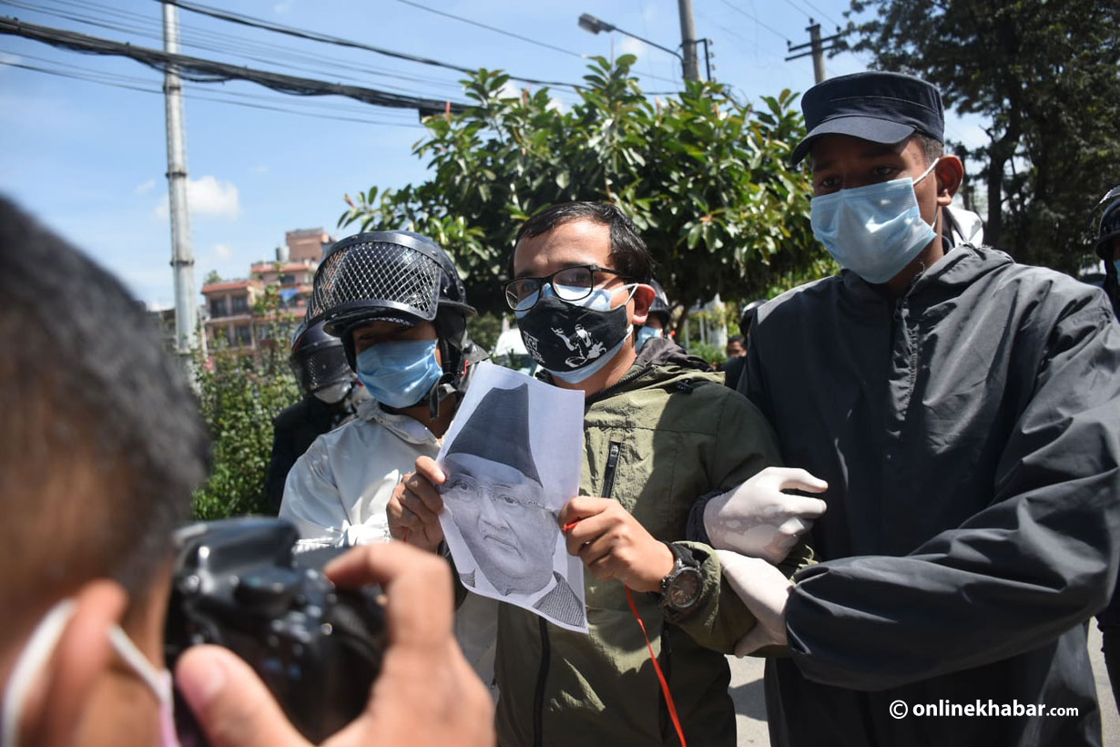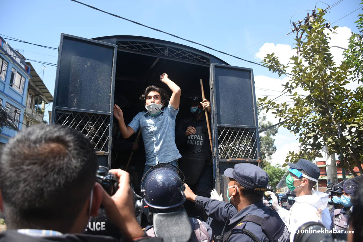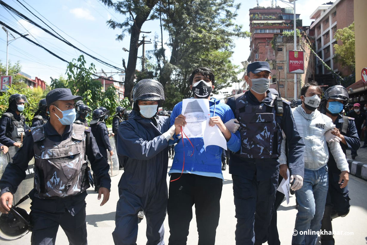 १० असोज, काठमाडौं । प्रधानमन्त्री केपी शर्मा ओलीविरुद्ध प्रदर्शनमा उत्रिएकाहरुलाई प्रहरीले नियन्त्रणमा लिएको छ । माइतीघर मण्डलामा मध्याह्न भेला भएर प्रदर्शन गरेका युवाहरुलाई प्रहरीले नियन्त्रणमा लिएको हो ।