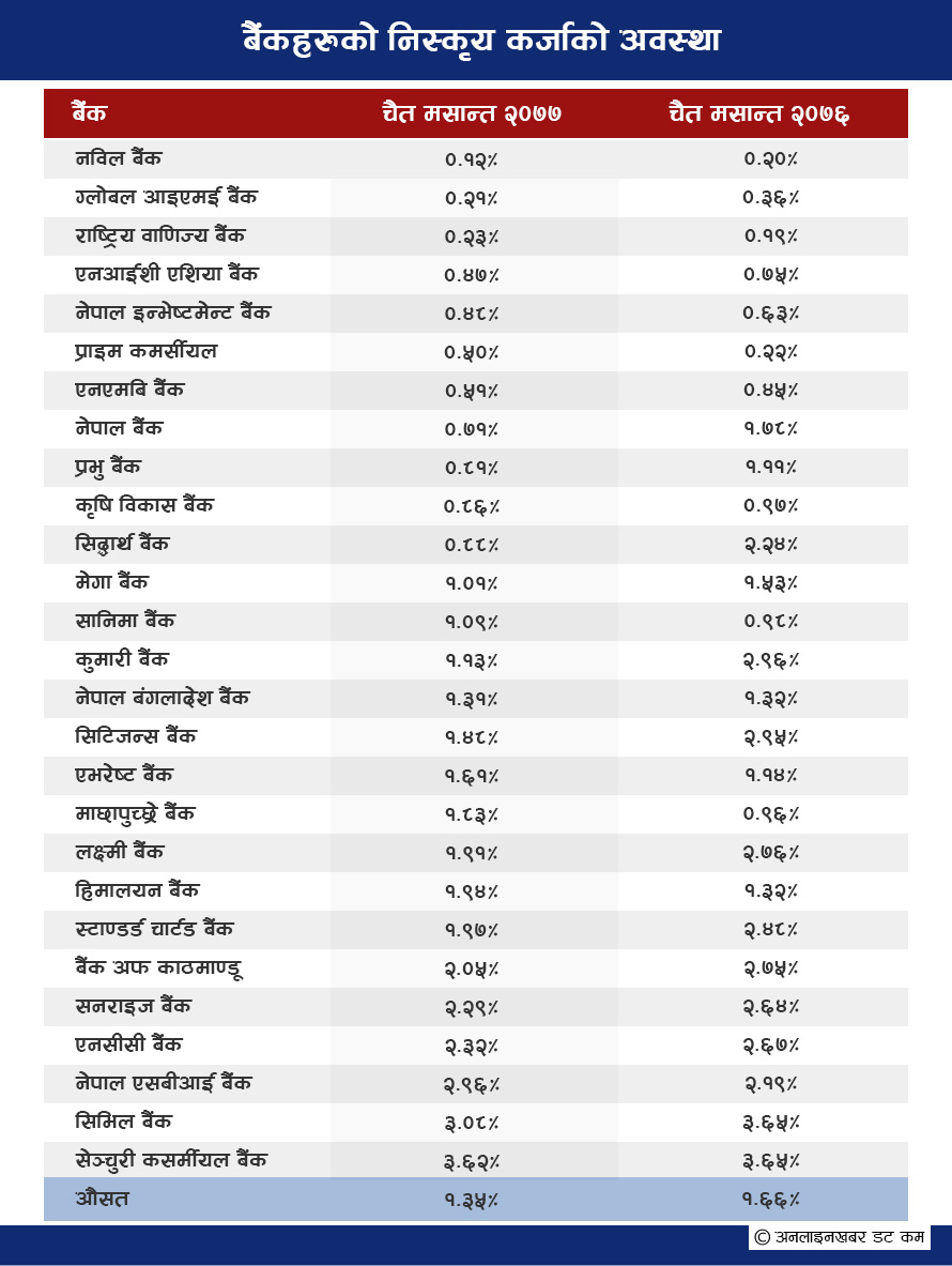 ग्लोबल आइएमईले निष्कृय कर्जा घटाएर ०.३६ बाट ०.२१ बनाएको छ भने पूर्ण सरकारी स्वामित्वको राष्ट्रिय वाणिज्य बैंकको भने निष्कृय कर्जा ०.१९ बाट बढेर ०.२३ प्रतिशतमा पुगेको छ ।