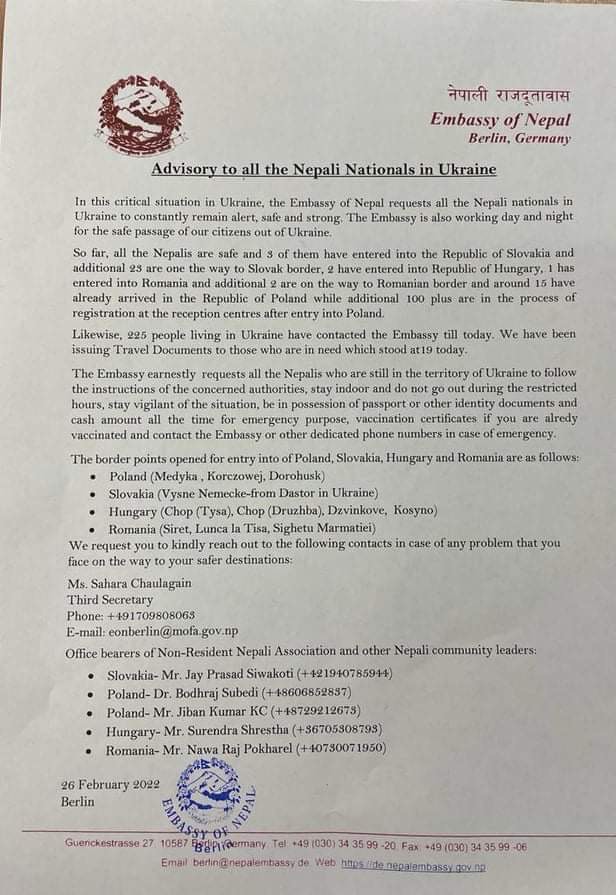 रुसले आक्रमण थालेपछि युक्रेनमा फसेका विदेशी नागरिकहरुका लागि मानवीय सहायताको आधारमा पोल्याण्ड, स्लोभाकिया, हंगेरी र रोमानियाले आ-आफ्ना देशका सिमाना खुल्ला गरिदिएका छन् । नेपालीहरुलाई पनि आवश्यक कागजपत्र बोकेरै तिनै देशतर्फ जान वर्लिनस्थित दूतावासले आग्रह गरेको छ ।